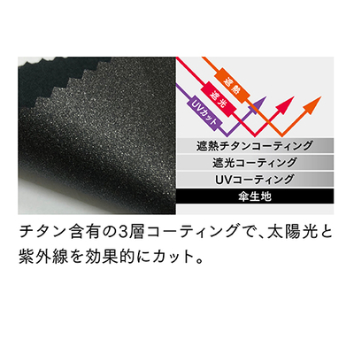 遮光・遮熱効果の高いチタンコーティング生地の晴雨兼用傘です。チタン含有の3層コーティングで、太陽光と紫外線を効果的にカットします。