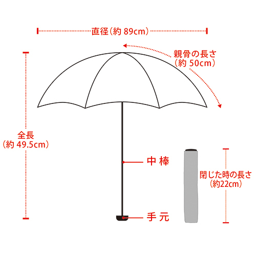 ●ポリエステル100%、カーボンファイバー、アルミ、ABS樹脂●親骨サイズ50cm●6本骨●傘の直径:89cm●全長49.5cm(収納時22cm)●141g●遮光率100%※JISL1055 A法による生地の測定値●UVカット率:99.9%以上●中国製