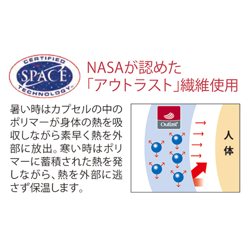 NASAのために開発された新素材アウトラスト繊維を使用。アウトラストの温度調整機能で、薄くてもとっても暖か、快適な体感温度へコントロールします。上下のヘムがぴったりとフィットします。