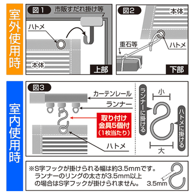 すだれのような構造と表面のアルミが、夏の日射しを木陰のようなやわらかな日差しに。S字フック金具で室内のカーテンレールにも取付可能。裏面(室内側)は黒色で、外の景色が見えやすくなっています。