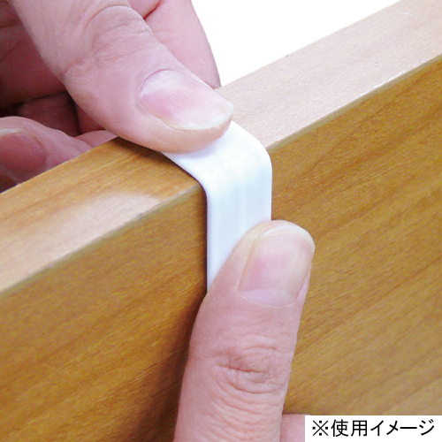 扉や引き出しに、板の厚みに合わせて折り曲げて取り付けるだけで便利なフックが完成。取り付け場所を傷つけにくいキズ防止パッド付。