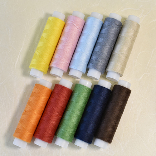 ●糸:ポリエステル、芯:ポリプロピレン●長100m●10本セット(黄・ピンク・ベージュ・水色・グレー・オレンジ・赤・緑・紺・茶)●糸の太さ:60番手●タイ製
