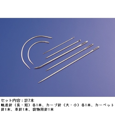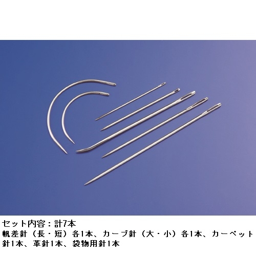 帆差針、カーブ針(マットレス針)、カーペット針、革針、袋物用針の5種類計7本の特殊針が入ったセット。革製品やご自宅にある針では縫えないような分厚いものまで縫えます。