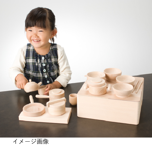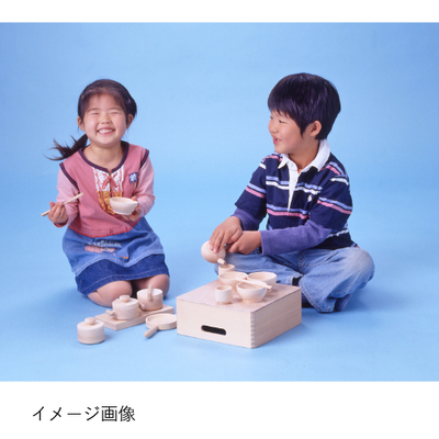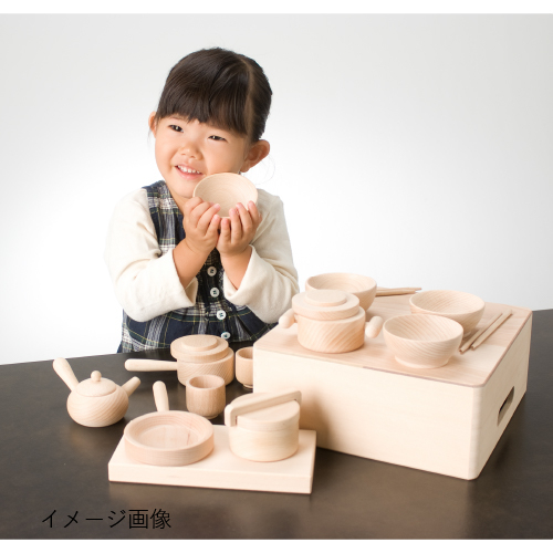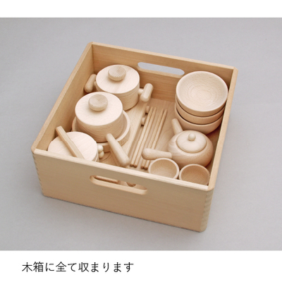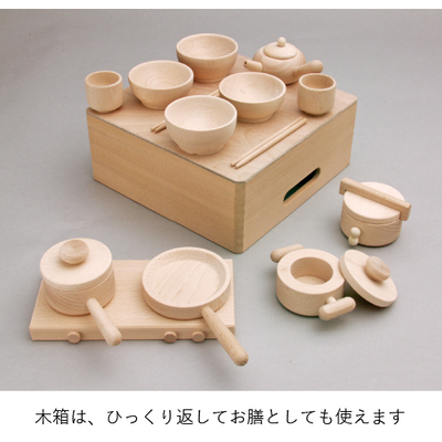 お父さん、お母さんの真似をして、社会性が育っていきます。小さな手にしっくりなじむ大きさです。木箱はひっくり返してお膳としても。