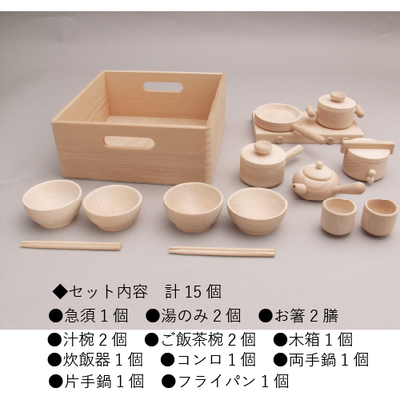 ●木箱:セン・シナ合板、食器:ブナ(無塗装)●木箱:24.5×24.5×高10cm、サイズ1例/コンロ:20×10×高2cm●1.5㎏●セット内容:急須1個、湯呑2個、お箸2膳、汁椀2個、ご飯茶椀2個、炊飯器1個、コンロ1個、木箱1個、両手鍋1個、片手鍋1個、フライパン1個●対象年齢/3歳〜●日本製