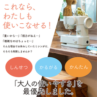 「重いから・・」「視力が・・」「複雑なのは・・」そんな課題を解決したミシン。使いたいときにサッと取り出し使えて本棚に入るコンパクトサイズ。針穴が見えやすい針穴糸通しスイング機構。シンプル設計。フットコントローラー式です。ミシンを使うこは頭と目と手を同時に動かすことで脳の活性化につながります。