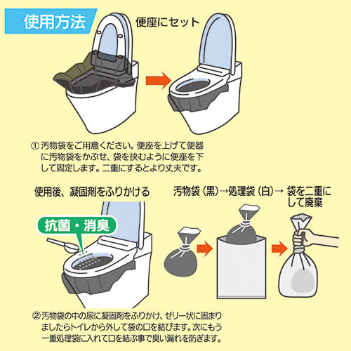 断水・停電時などの緊急時に水なしで使える簡易トイレです。抗菌・消臭機能で、尿などの排泄物をすばやく固めて密閉し、災害時に悪化しやすい衛生環境や悪臭対策のお役に立ちます。