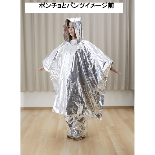 いざという時に暖をとれる、カサカサ音がしにくい静音加工仕様のアルミ製ポンチョとパンツのセット。