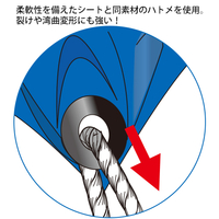 柔軟性を備えたシートと同素材のハトメを使用。裂けや湾曲変形にも強い。便利なシート紐付。災害時以外に通常レジャーにも