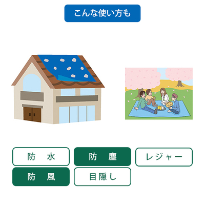 柔軟性を備えたシートと同素材のハトメを使用。裂けや湾曲変形にも強い。便利なシート紐付。災害時以外に通常レジャーにも