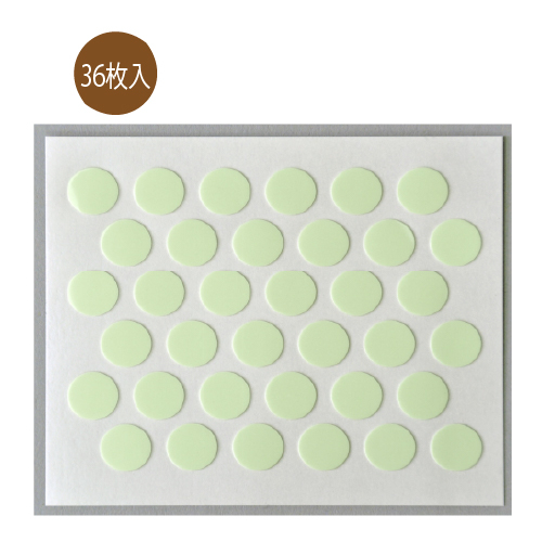 ●表面:PETフィルム、基材:蓄光材・ポリエステル樹脂、粘着剤:アクリル系、剥離紙:ポリプロピレン●径10mm●36枚入り●蛍光灯などの光を約20分照らすことで暗闇で約6〜8時間発光●日本製
