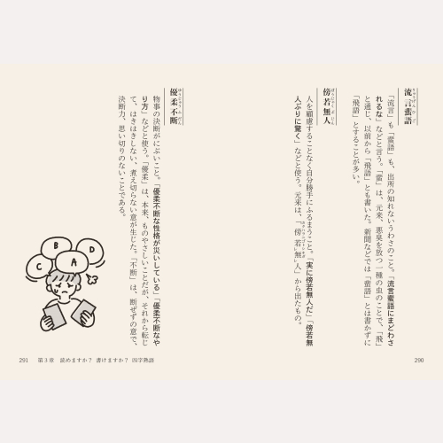 ついスマホに依存して、年々言葉が読めない、書けないようになっていませんか。そんなあなたに、この本を。国語学の第一人者が、大勢の人が意味を正しく知らない日本語、読みにくい熟語など600ワードを解説。「赤の他人」の赤には「全く」の意味があるそう。「膾炙」(かいしゃ)は読み書きともに難しいが、広く知られること。文庫本なのですき間時間にパラパラするのに最適。巻末の索引もお役立ち。(み)
