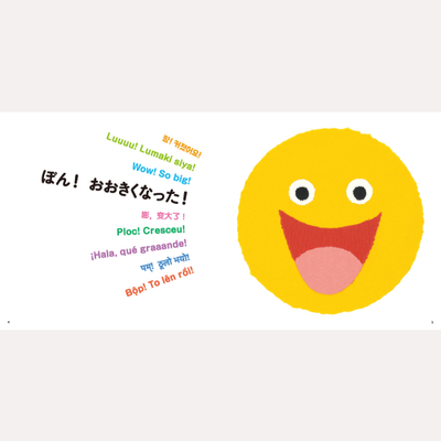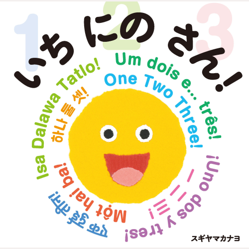 赤ちゃんの大好きな黄色い丸い顔が、「いち にの さん!」で大きくなったり、びろーんとのびたり。日本語のほか、中国語や英語、韓国語やベトナム語など9つの言葉で書かれています。図書館のおはなし会や保育園・幼稚園でも外国にルーツを持つ子に出会うことが珍しくなくなりました。みんなで楽しむためにも、子どもたちが仲よくなるためにもおすすめです。QRコードで音声も聞けます。(由)