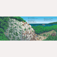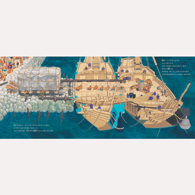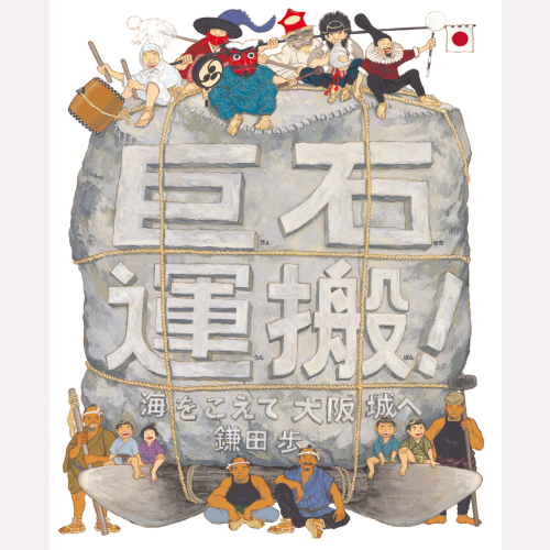 約400年前、大阪城建設のため小豆島から多くの石が運ばれました。石工たちが特殊な道具と洗練された技術を駆使して巨大な岩からきれいな形の石を切り出し、「シュラ」と呼ばれる丸太づくりの大きなソリに乗せて運ぶ様子が、ページ3面にわたるイラストで緻密に再現されています。開いたページの右半分が観音開きという特殊な仕様ゆえの大迫力!ぜひ手に取って体感してみてください♪(楽)