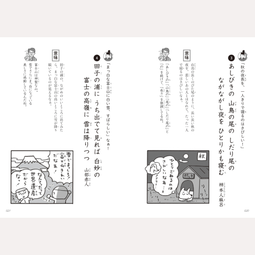 齋藤先生の超わかりやすい解説とマンガで解説。最後まで読むと、1冊に同じ歌が4回出てくるので、100首がスルっと覚えられて、いつのまにか諳んじられるようになります。