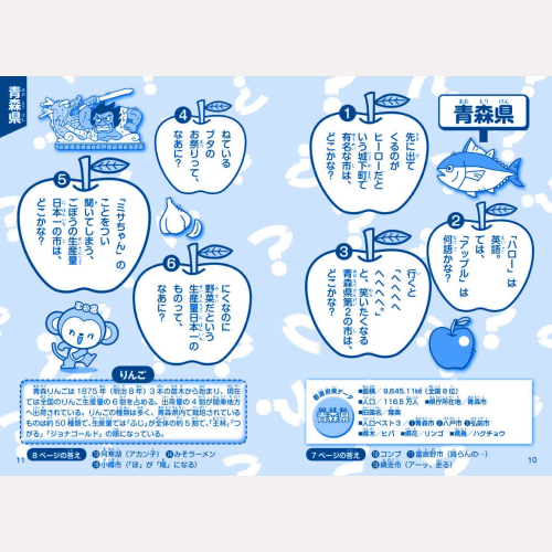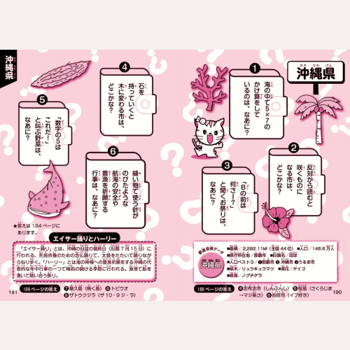 各都道府県名、市名町村名、地名、偉人、行事などの「おもしろなぞなぞ」が大集合! なぞなぞで頭をひねりながら、各都道府県の名産・名物・地理を覚えていこう。