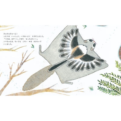 雪のおにぎりみたいな可愛いシマエナガと空を飛ぶエゾモモンガ。そんなふたりが風に飛ばされて出会い、一緒に遊び、森の中を飛び回って冒険する物語です。