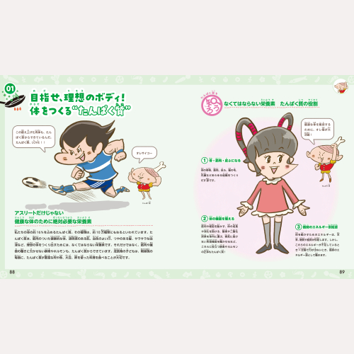 どうしておなかがすくのかな? 水を飲んでも太るって本当? たんぱく質やビタミンなどの栄養素がキャラクターとなって登場。健康に欠かせない「栄養」の知識をオールカラーイラスト図解。親子で楽しく学べます。 【本書の内容】●食べたら体の中では何が起こっているの? ●給食の「色」を見抜こう! ●野菜なら何でも栄養たっぷり? ●健康維持に欠かせない、重大任務を果たす“ビタミン” ●1日に必要な私のエネルギー源? 他