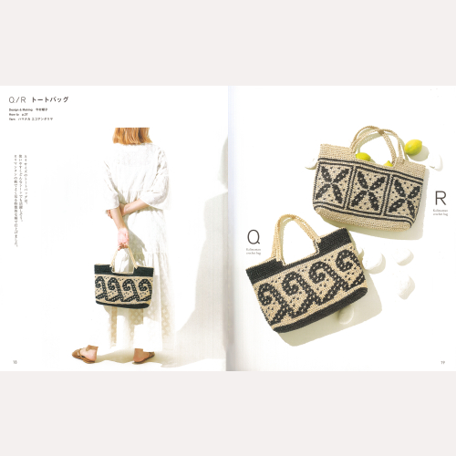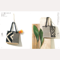 夏糸の定番糸・エコアンダリヤを使用し、編み込みで幾何学模様を表現。大人らしくおしゃれなベージュ×黒を基本とした配色で、トートバッグや、ハンドバッグ、丸底バッグ、がま口バッグなど様々な形のバッグに模様を組み合わせてご紹介しています。