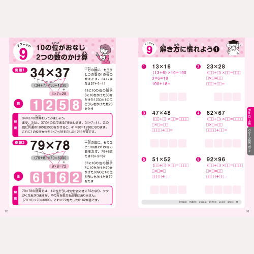 99×99まで、どんな2ケタかけ算もサッと解けるようになる暗算法とドリルを収録。秘密のテクニックで驚くほど計算が速くなる! 大人の脳トレにもおすすめです。