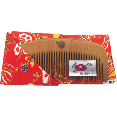 樹齢約50年以上の利島産の椿材を使用。大阪・和泉の櫛職人が1本1本なめらかに研磨し、椿油で仕上げました。手に収まりのよい3寸(約9センチ)、歯の間隔は約2ミリです。椿は堅く、割れが少ない木質で、磨くと光沢がでるのが特徴です。より固く、割れにくくするため燻蒸処理を施しています。使い始めは独特のにおいがありますが、時間とともに薄れます。天然木のため色に個体差があります。和紙ケースの色・柄は指定できません。■この品目は返品対象外です■
