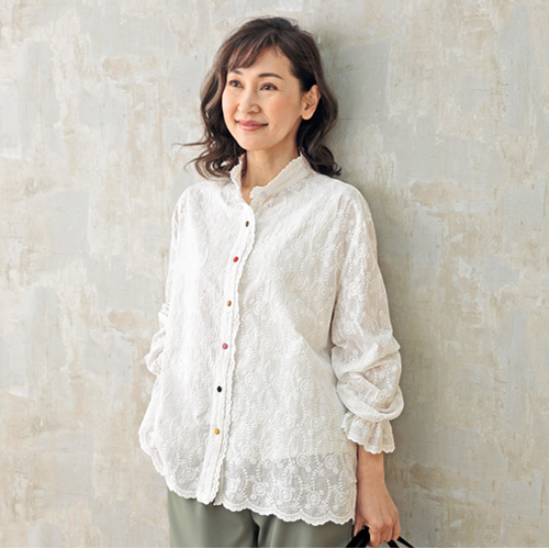 トップ > 着るカタログ > 総刺しゅうスタンド襟配色ボタンブラウス オフホワイト LL
