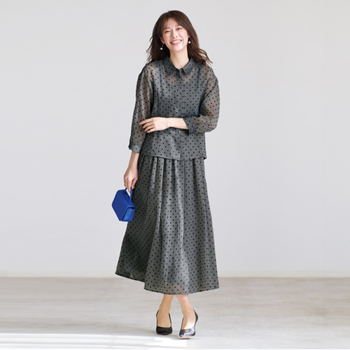 ほんのり上品な透け感素材のブラウスは、インナーを変えることでシーズン長く着用可能。甘くなりがちなドット柄も、モノトーンカラーで大人な着こなしに。
