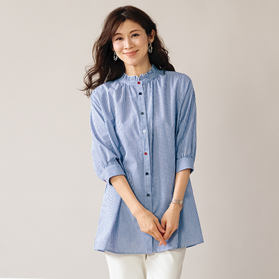 バンドカラーにフリルをあしらった清涼感のあるストライプ柄のロングブラウス。