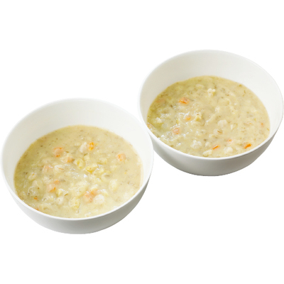 ペースト状にした茶豆に、キャベツ、玉ねぎ、人参ともち麦が入った具だくさんの「食べるスープ」。国産の生クリームや牛乳を使ってクリーミーな味わいに仕上げました。乳製品が手軽に摂れるほか、プチプチしたもち麦の食感が良く、飽きることなく食べられます。1食分×2袋入り。湯せんで約8分。