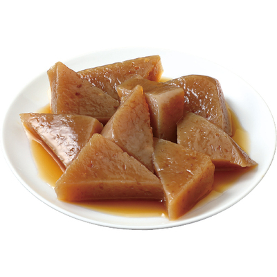 粒状のこんにゃくを固めてつくったやわらかいこんにゃくの煮物。かつおだしの効いた醤油ベースの味付け。そのままはもちろん、野菜や練り物を足しても。