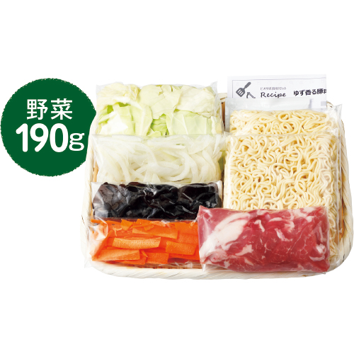 フライパンになたね油を熱し、ひと口大にカットした豚肉と具材を炒め、全体に火が通ったら焼きそば麺を加え、添付のゆず塩たれで仕上げます。主食と主菜、副菜を兼ねる香りのよい一皿。豚肉でたんぱく質、野菜で食物繊維が摂れます。きくらげにはビタミンDが豊富。2〜3人分。調理時間:約10分。家庭で用意するもの:なたね油大さじ1。調理法:炒める※使い切りのセットです。レシピ付き。必ず加熱してください。消費期限はお届け日の翌日です。利用促進のため2月3回価格に対し19円引き。