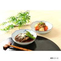 和食が映えるからし柄の上品な器。アクセントになる縁取りが料理を引き立てます。煮物や煮浸しなど汁気のある料理の盛りつけに。