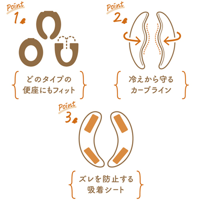 特殊製法の立体フィット構造でどんな便座にもすばやくフィット。ピタッとズレにくい裏面吸着シートでつけはずしも簡単です。汚れてもお洗濯して繰り返しご使用いただけます。便座の内側まで包みこむから、寒い冬でも内ももがヒヤッとしません。