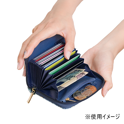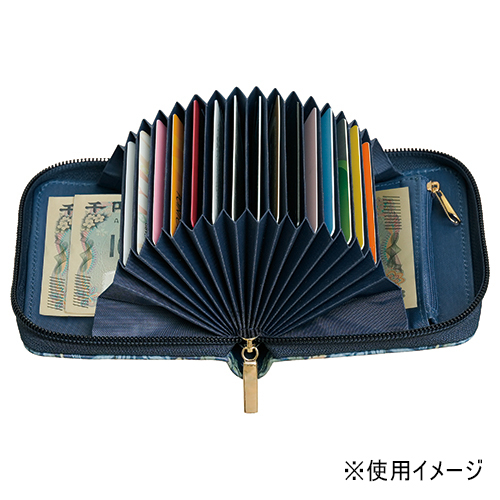 ●表生地:合成皮革(ポリウレタン樹脂コーティング)、内側生地:ポリエステル100%●縦9×横11.6×高3.2cm●105g●仕様/開閉ファスナー式、じゃばら式カードポケット×15、フリーポケット×2、ファスナー付きポケット×1●中国製※柄の出方はそれぞれ異なります。