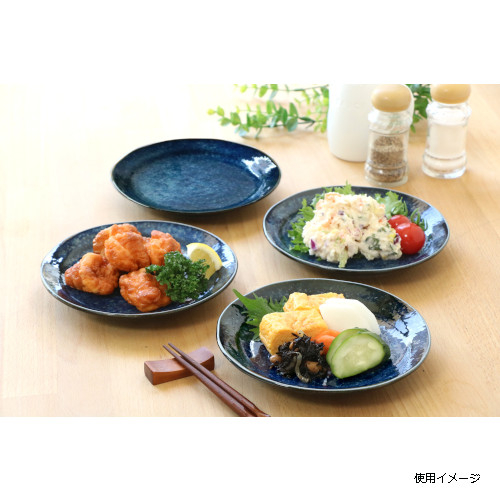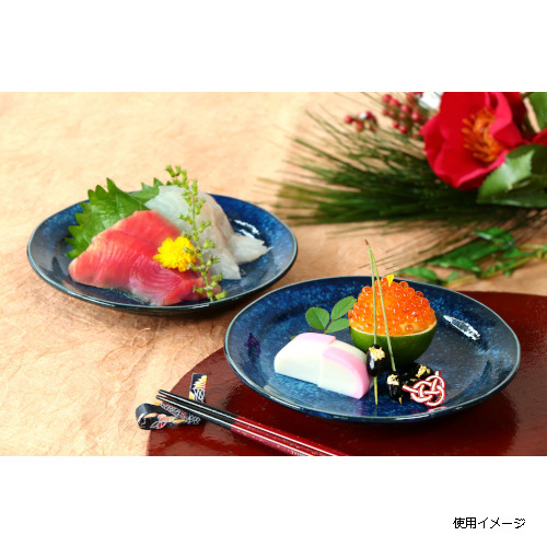 深い紺窯変が和洋どんな料理も引き立てます。盛皿にも取皿にも使え、出番の多い器です。お祝いの席にも。フチは揺らぎをつけた趣のある形状。