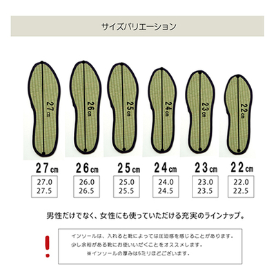 畳の原料であるい草を使用したインソール。踏み心地がよく、い草がもつ自然の調湿・消臭作用で蒸れず臭わず快適です。