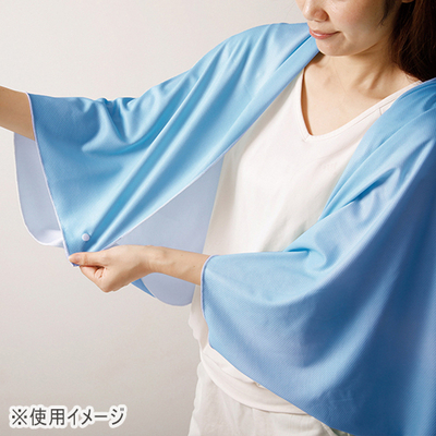 日差しが気になったらサッと羽織るだけでUV対策ができます。接触冷感生地でサラッと快適です。暑い日には濡らして振るだけ、クールタオルやストールとして、スナップを留めてケープとして3Wayに使えて便利です。パッケージは収納ポーチになっており、濡れたまま持ち歩けます。