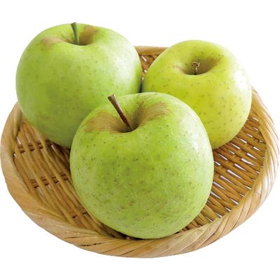 黄緑色にソバカスのような斑点が入った果皮。酸味は少なめ。糖度14度以上を満たした産地お奨めのりんごです。品質保持のため家庭でもポリ袋に入れて冷蔵庫で保管してください。
