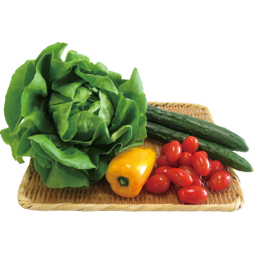きゅうり2本、カラーピーマン1個、ミニトマト150g、サラダ菜1個