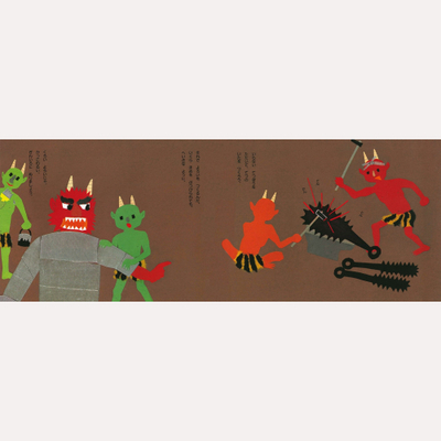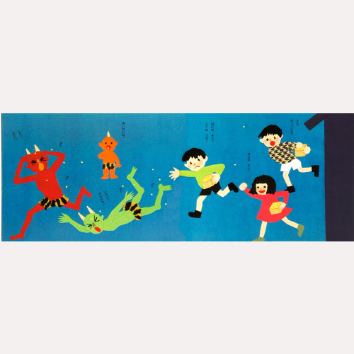 豆まきで鬼たちは逃げだしますが、残された可愛いちび鬼は人間の子どもたちと仲良く遊びます。鬼の親分がちび鬼を連れ戻しに、よろいを着て来ますが、豆まきに降参。親分はちび鬼のお父さんでした。心が和む楽しい絵本です。