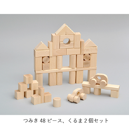 ●ブナまたはシラカバ(無塗装)●サイズ一例/立方体:3×3×3cm、くるま:4.8×7.5×4.5cm●1.4kg●つみ木48ピース、くるま2個●対象年齢/1歳半〜●日本製