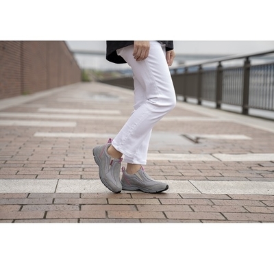 かかと部を包む3D形状のインソール。土踏まず部を持ち上げ、かかと部をしっかりとホールドすることで歩行時の安定を図り、衝撃吸収・反発弾性を実現します。かかと部に車のライトなどで反射する反射つき夜間の歩行も安全です。