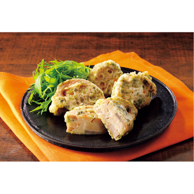 消費材の鶏肉を使ってほんのり醤油味にした具材を茨城県産のれんこんで挟み、なたね油で揚げました。アオサを混ぜた衣で風味豊か。オーブントースターか電子レンジで温めるだけで手軽に食べられます。お弁当にも。
