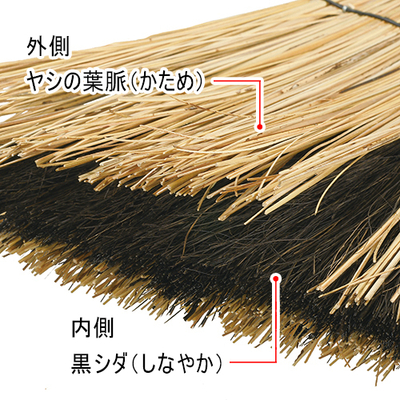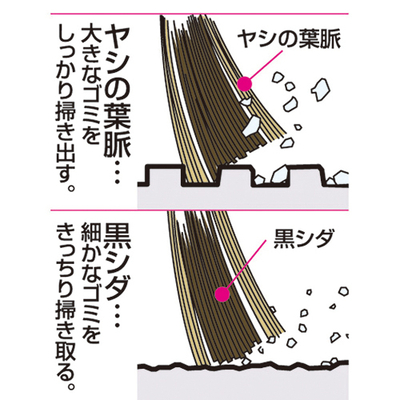 硬めの穂としなやかな穂を束ねた3層構造で、大きなゴミと細かなホコリをまとめて掃き出せます。腰をかがめずに掃ける長柄の外用。