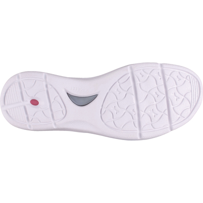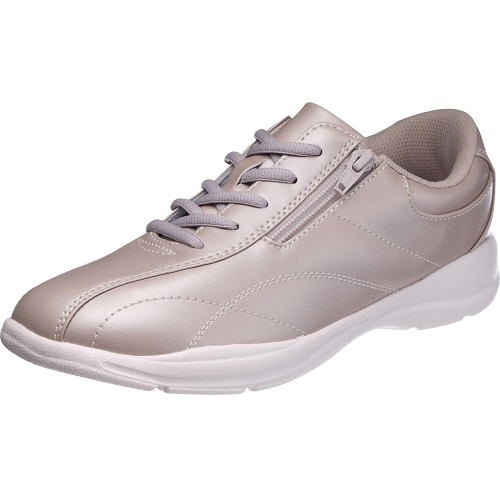 4E設計ですが、すっきりとしたシルエットと、光沢のあるデザインのウォーキングシューズです。軽量で、外ファスナー付き。脱ぎ履きのしやすさも魅力です。