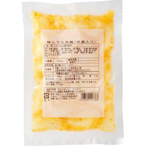 大根(国産)、漬け原材料(柿(国産)、砂糖(国内製造)、甘酒(米こうじ(米(山形)))、食塩、米麹(米(山形)、こうじ菌)、昆布エキス、米酢、柿酢(柿(国産))、かつおエキス)