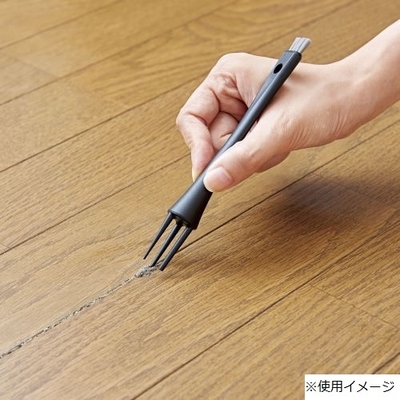 フローリングの溝の幅に合わせ溝スティックは1mm、2mm、3mmに対応。反対側は巾木などのホコリ取りに便利な柔らかブラシ。ガラス繊維入りのナイロン樹脂でフローリングに傷がつきにくく、丈夫でしなやかです。使わない時は引っかけて収納できます。