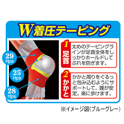 足首とかかとをダブルロックすることで足首全体がブレないので、軽やかに足が運べます。太めのテーピングラインが足首全体をしっかりホールドしてブレを防ぎます。