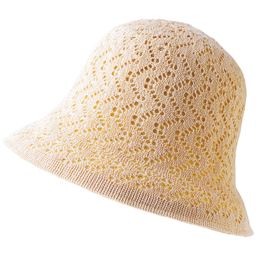 涼し気な透かし編み柄です。通気性が良く、暑い日もムレにくいので、サラッと快適。深く被れるので小顔効果にもなります。小さくたたんで鞄へ収納できるので持ち歩きにも便利です。