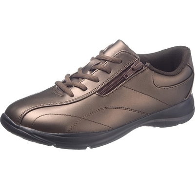 4E設計ですが、すっきりとしたシルエットと、光沢のあるデザインのウォーキングシューズです。軽量で、外ファスナー付き。脱ぎ履きのしやすさも魅力です。